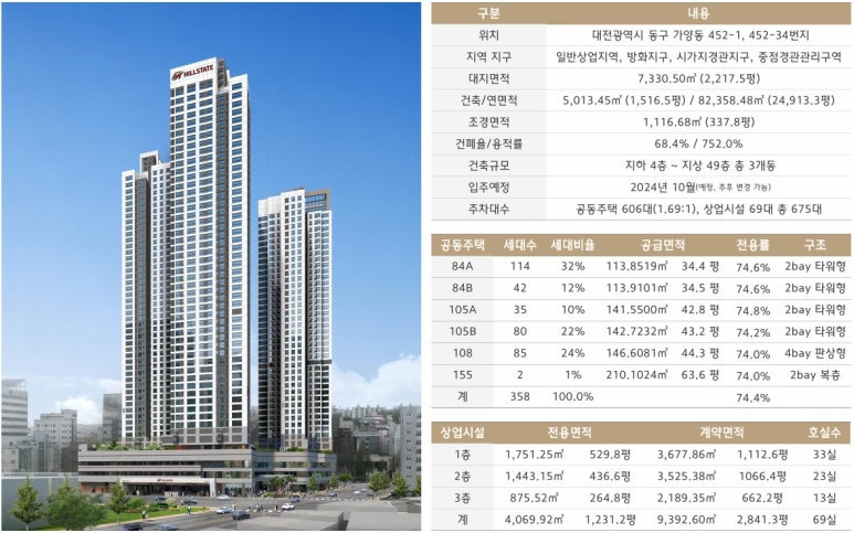 ▶ 대전시 동구 가양동 452-1, 일원으로 지하4층~지상49층(최고층) 3개동으로 아파트 358세대 및 상업시설 공급