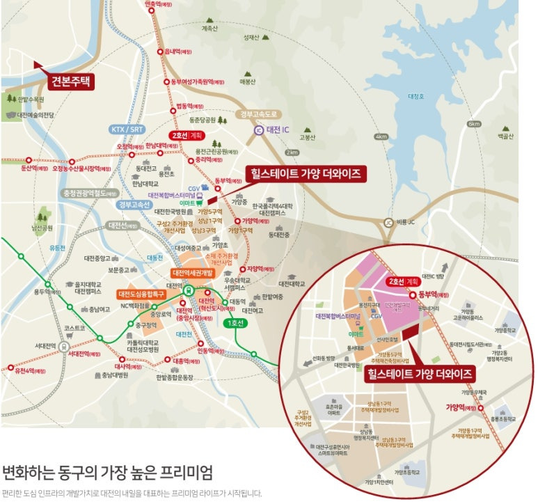 ▶ 대전ic, ktx대전역, 복합터미널 등이 인접해 있어 광역도시 접근성이 우수 하며, 동서대로, 한밭대로 가 인접해 유성구나 서구방향 접근 또한 용이 하다. 도시철도 2호선이 예정되어 있으며, 다수 시내버스 노선이 인접