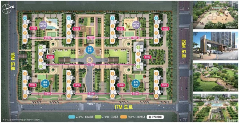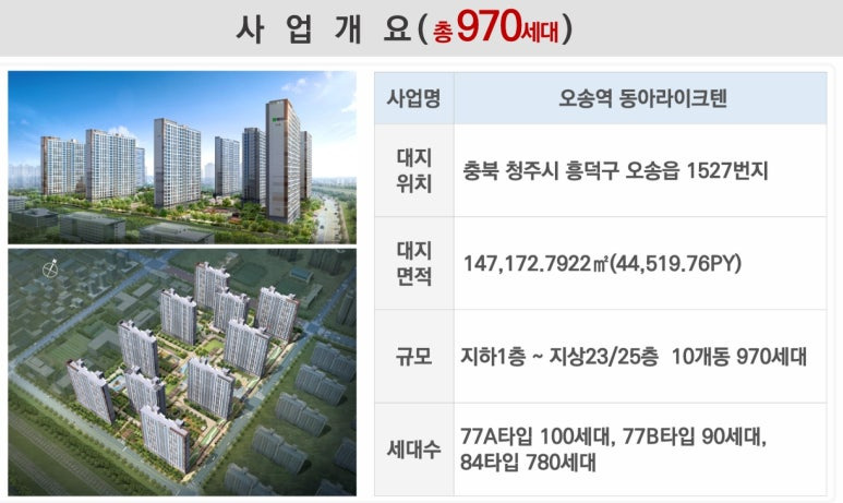 ▶ 청주시 흥덕구 오송읍 1527번지 일원 지하1층 ~ 지상25층(최고층) 10개동 970세대, 77타입 190세대, 84타입 780세대 규모로 공급