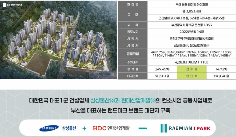 ▶ 부산광역시 동래구 온천동 1853번지 외 일원 / 지하4층 ~ 지상35층(최고층) 32개동 / 공동주택(아파트) 총3,853세대(민간임대 200세대 포함), 복리부대시설, 근린생활시설 공급