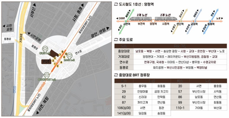 ▶ 양정역(부산1호선)7번출구, 직통연결(예정), 중앙대로 시내버스 구간으로 차량정체 없이 이동 가능 하며, 만덕2터널 교통분산 및 서부산 접근이 용이