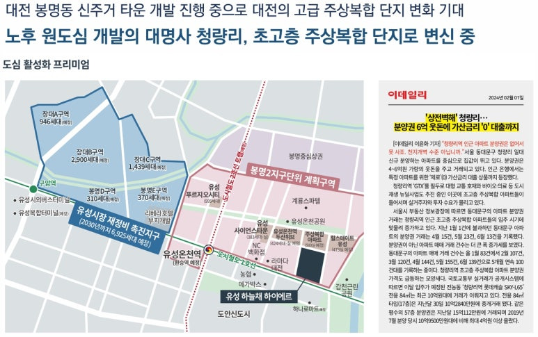 ▶ 노후 원도심 개발의 대명사 청량리, 초고층 주상복합 단지로 변신 중으로 부동산 가치의 상승 효과 그대로 대전 봉명동 신주거 타운 개발 진행 중으로 대전의 고급 주상복합 단지 변화 기대