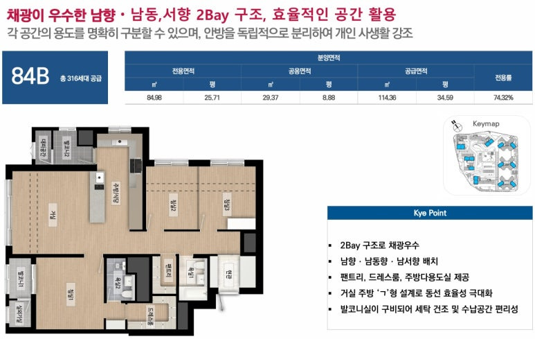 배치, 전세대 선호도 높은 남서향, 남동향 호실을 중심 배치하여 쾌적한 주거 환경 영위