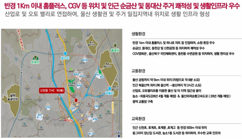 ▶ 농소-외동국도(예정), 북울산역 동해선광역전철(예정), 울산외곽순화도로(예정)등, 산업로, 오토밸리로, 이외 완전개통, 7번국도등 광역교통 인프라