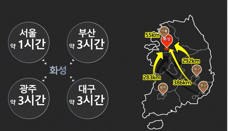 ▶ 77번 국도 이용시 안산 20분대 송산그린시티 15분으로 또한 제2외곽순화고속도로 비봉-매송간고속도로, 평택시흥간 고속도로 이용이 용이하여 수도권 진입이 수월하다.