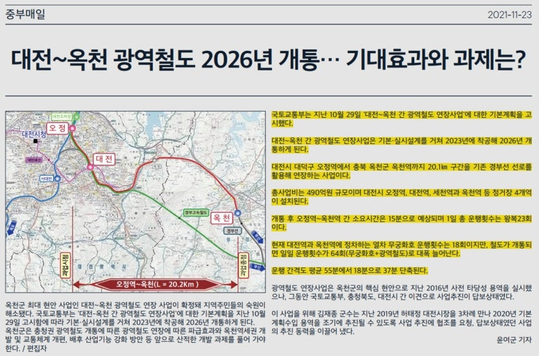 ▶ 충청권광역철도 대전-옥천구간 연장(2026년 예정) 옥천역을 통해 대전 시내로 빨라진 접근성