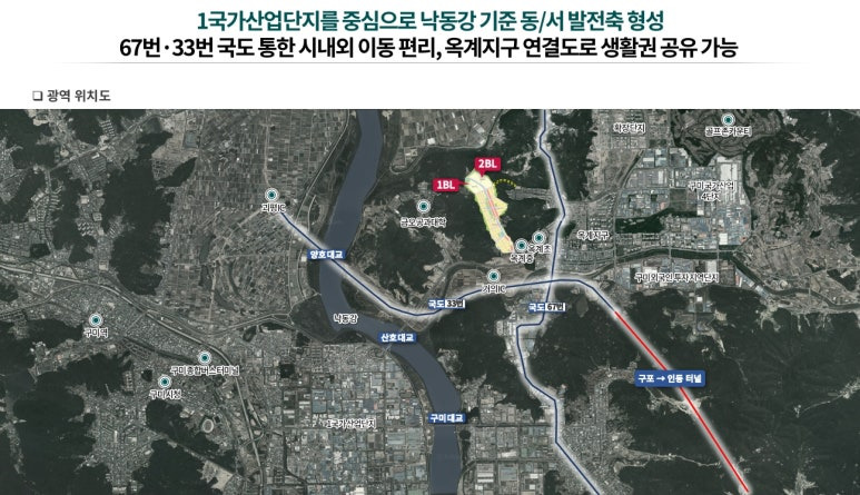 ▶ 사업지는 1국가산업단지를 중심으로 낙동강 기준 동,서 발전축 형성으로 67번.33번 국도 통한 시내외 이동이 편리한 입지로 옥계지구 연결도로 생활권 공유 가능
