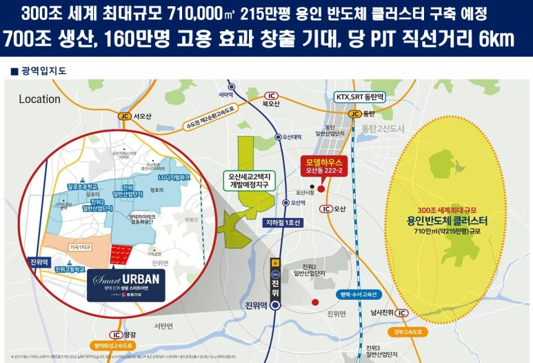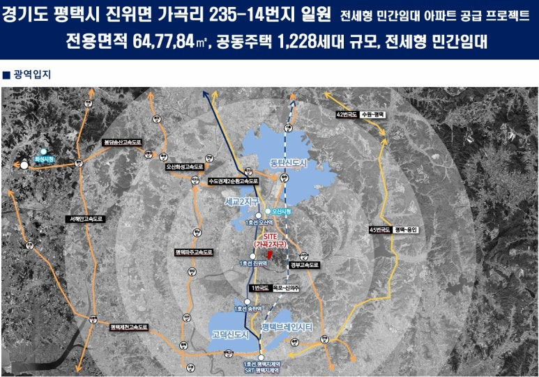 ▶ 사업지는 1번국도, 경부고속도로 오산IC 및 예정중인 남사 진위IC 진입이 편리 한 사통팔달로 주변 광역도시로 이동이 편리, 1호선 진위역(차량5분거리), 오산역, SRT지제역 등 광역 교통망 화성, 기흥, 판교, 광교 등 주변 산업단지 및 테크노밸리와 인접한 배후 주거 직주근접 도시