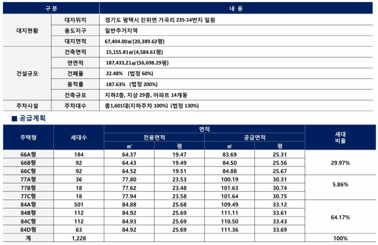 ▶ 경기도 평택시 진위면 가곡리 235-14번지 외 일원 / 지하2층 ~ 지상29층(최고층) 총14개동 / 공동주택(아파트) 총1,228세대, 복리부대시설, 근린생활시설 등 공급예정