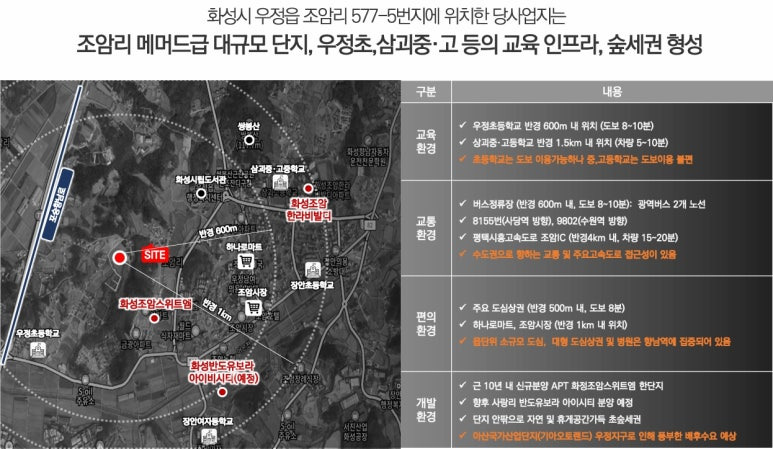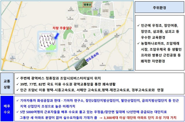 ▶ 근 10년 내 신규분양 아파트 화성조암스위엠 한단지 뿐, 단지 안팎으로 자연 과 휴게공간가득 초숲세권 단지, 아산국가산업단지(기아오토랜드) 우정지구로 인행 풍부한 직주근접 입지로 향후 프리미엄 기대