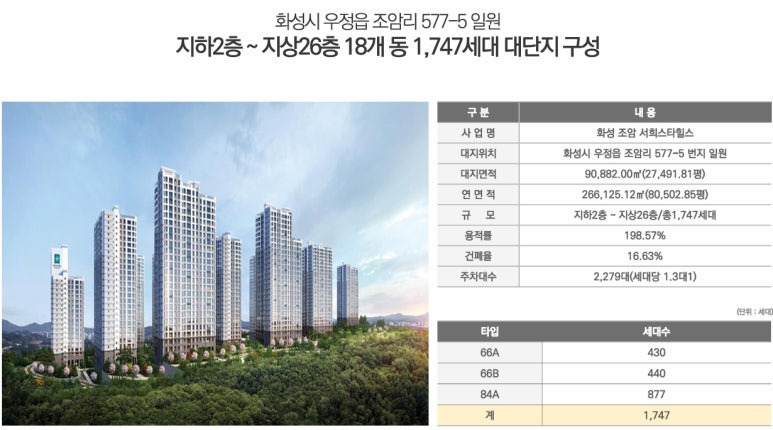 ▶ 경기도 화성시 우정읍 조암리 577-5 외 일원 / 지하2층 ~ 지상26층(최고층) 총18개동 / 공동주택(아파트) 총1,747세대, 복리부대시설, 근린생활시설 등 공급예정