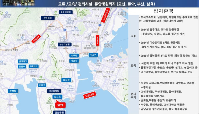 ▶ 당 사업지는 남항대교, 부산항대교, 광안대교로 이어지는 논스톱 쾌속교통망, 충무대로로 연결되는 우수한 도심 접근성과 광역교통망의 편의성 또한 지하철1호선으로 부산역, 서면역 등 대중교통을 이용한 부산 중심지로 편리한 이동이 가능한 입지