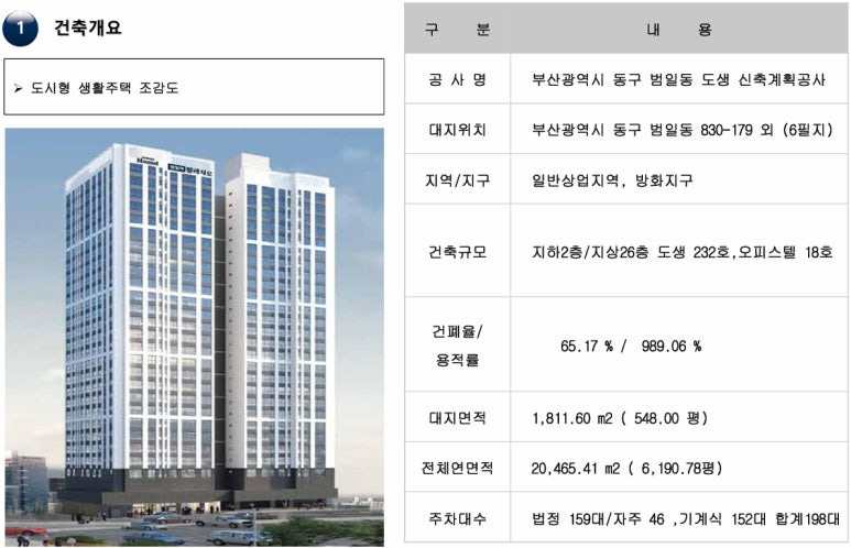 ▶ 부산광역시 동구 범일동 830-179번지 외 일원 / 지하2층 ~ 지상26 총2개동 / 공동주택(도시형생활주택) 232세대, 주거용 오피스텔 18실, 복리부대시설, 근린생활시설 등 공급