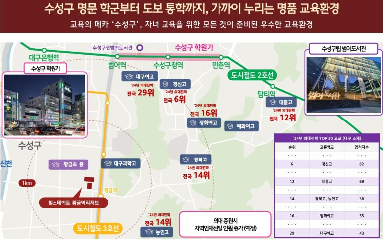 ▶ 사업지 인근 경신고, 경북고, 대구여고, 대구과학고 등 명문학군과 더블어 황금초.중 안심 안전한 도보 통학 교육환경, 수성구 학원가 이용이 편리한 입지