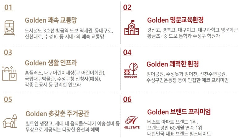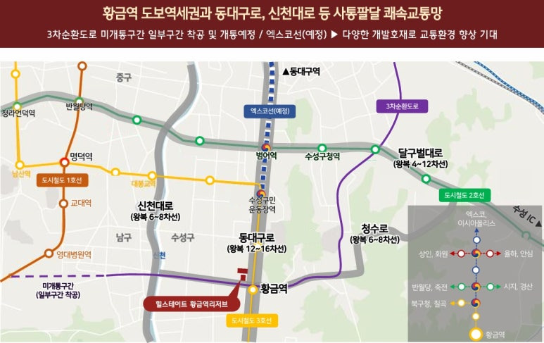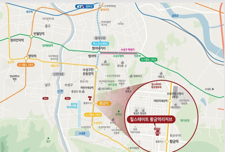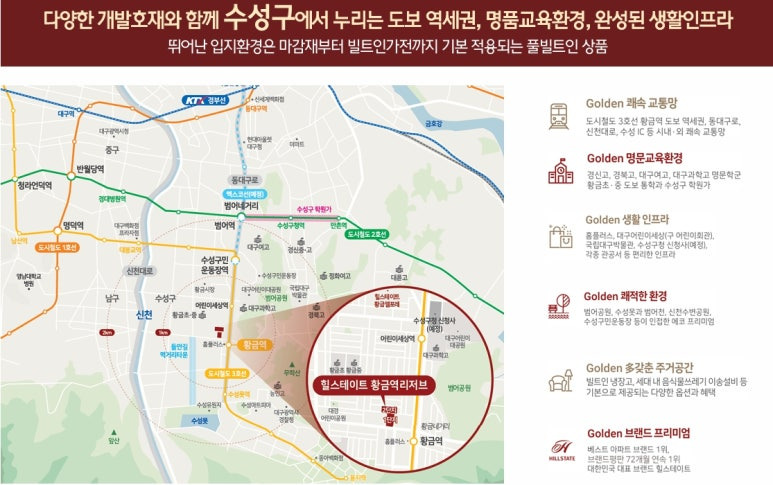 ▶ 당 사업지는 도시철도3호선 황금역 도보 역세권 입지, 동대구로, 신천대로, 수성ic 진입 편리 시내.외 쾌속 교통망으로 대중교통, 자차를 이용 편리한 이동