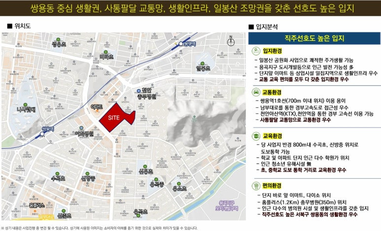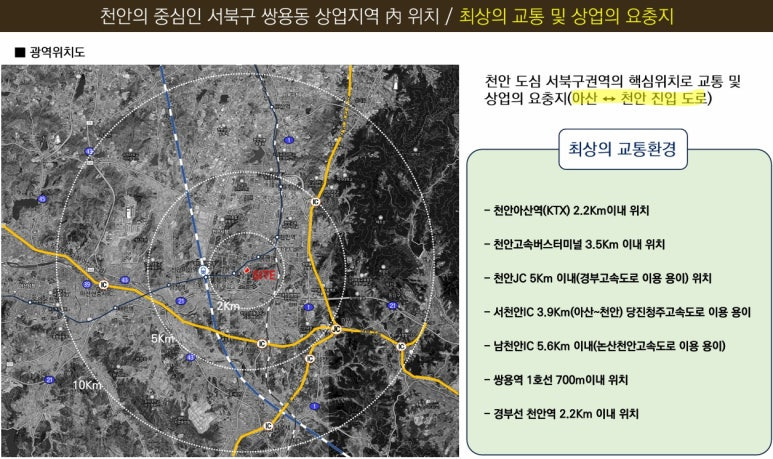 ▶ 당 사업지는 천안 쌍용역1호선 700m 역세권 입지로 대중교통을 이용한 시내 이동이 편리한 입지, 남부대로를 통한 경부고속도로 접근성이 우수, 천안아산역(ktx), 천안역을 통한 경부고속선 이용 가능, 사통팔달 교통망으로 교통환경이 우수한 입지
