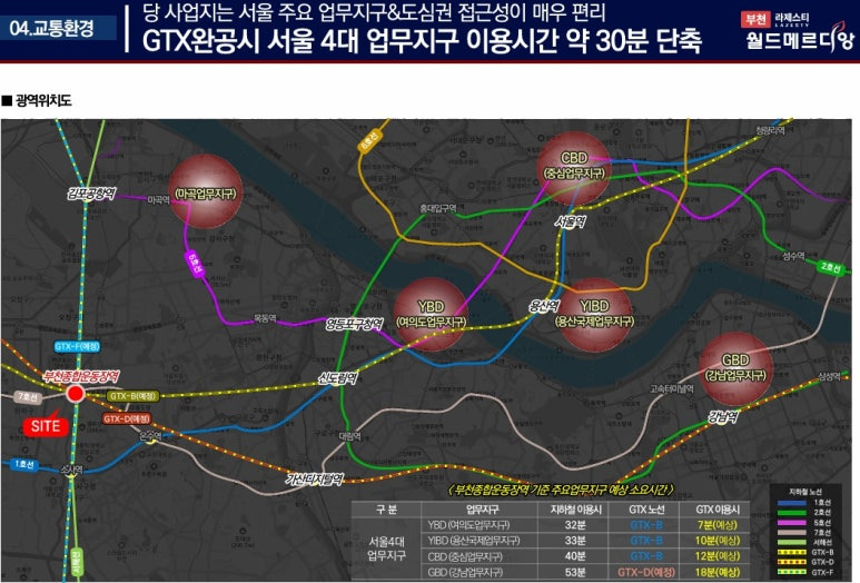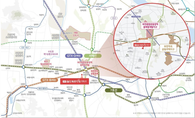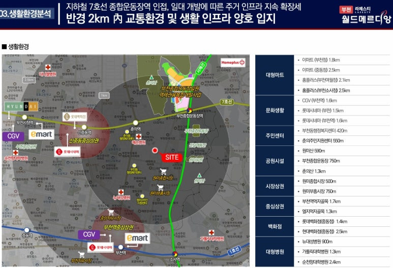 ▶ 당 사업지는 지하철7호선 춘의역 도보5분거리의 역세권 입지, 부천 종합운동장역 도보 9분거리로 사업지 내 1km 거리, 도보 이용가능 지하철 입지로서 대중교통을 통한 서울 인천 광역도시 이동이 편리한 입지