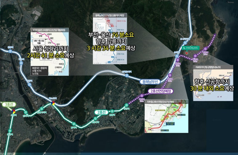 ▶ 서울 청량리에서 사업지까지 2시간41분 소요예상, 부전-울산76분소요, 향후 강릉까지 3시간34분 소요예상, 가덕도 신공항까지는 30분내외 소요 예상