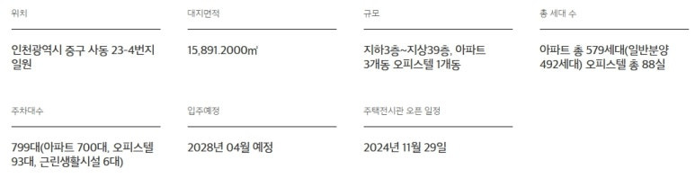 ▶ 인천광역시 중구 사동 23-4번지 외 일원 / 지하3층 ~ 지상39층 아파트 3개동, 주거용 오피스탤 1개동 / 공동주택(아파트) 총579세대, 주거용 오피스텔 총 88실, 복리부대시설, 근린생활시설 공급예정