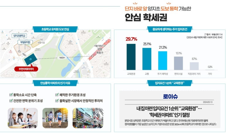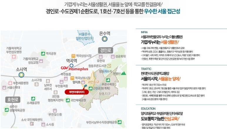 ▶ 사업지는 서울 구로구와 연접, 서울 향동지구 생활인프라 공유하며, 역곡역 상권, cgv, 홈플러스, 향동지구 먹자상권 등 이용이 용이하며 스타필드 시티부천, 이마트 트레이더스(3.2km) 차량 10분거리로 이용 편리하다. 천왕산, 푸른수목원 및 단지 인근 근린공원 등 녹지기반시설이 풍부한 그린 환경 서울과 부천을 모두 누리는 더블생활권으로 가깝게 누리는 서울생활권으로 매우 우수한 입지