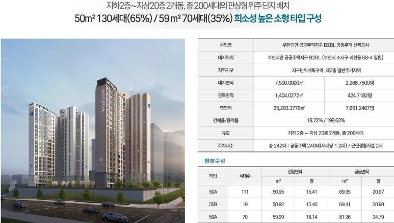 ▶ 경기도 부천시 소사구 괴안동 68-4 외 일원(부천괴안 공공주택지구 B2BL) / 지하2층 ~ 지상20층 2개동 / 아파트 선호도 높은 전용 50.95㎡타입, 50.92㎡타입, 59.99㎡타입 총200세대, 복리부대시설, 근린생활시설 공급예정
