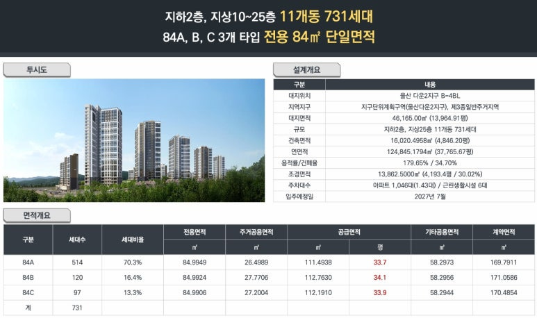 ▶ 울산광역시 중구 다운동 산30-2, 울산 다운2지구 B-4BL 일원 / 지하2층 ~ 지상25층(최고층) 총11개동 / 아파트 선호도 높은 전용 84㎡타입 으로 총731세대, 복리부대시설, 근린생활시설 등 공급예정