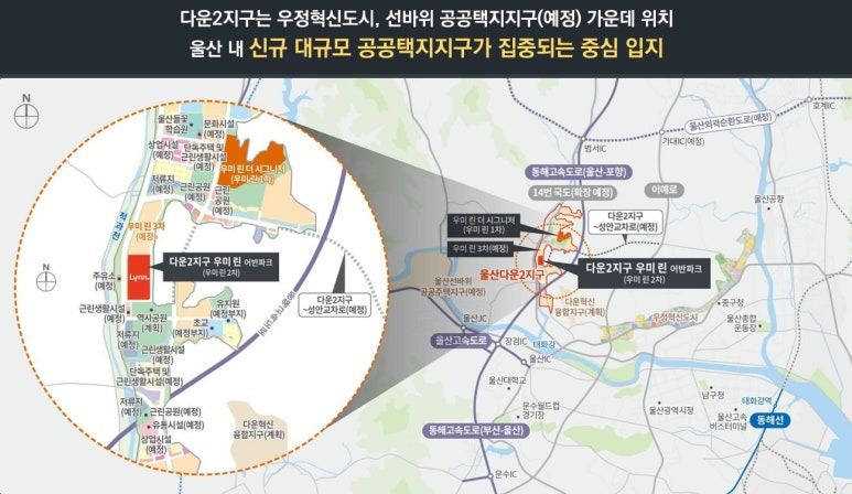 ▶ 울산-부산.울산-포항간 고속도로와 울산외곽순환도로(예정), 다운2지구-성안교차로(예정), 국도14호선(확장예정)등 부울경 및 울산 전지역을 빠르게 이동하는 쾌속 교통망