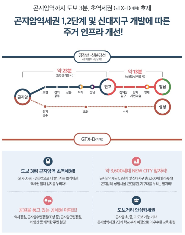 ▶ 사업지 바로 앞 보보 3~5분 거리의 곤지암역 초역세권으로 판교역, 수서역 6정거장 으로 서울, 수도권 도시로 대중교통을 이용한 이동이 매우 우수한 입지, 또한 곤지암IC, 중부.서울세종고속도로 진이 수월하여 자가용을 이용한 쾌속 광역교통망 프리미엄, 또한 GTX-D(계획)노선으로 삼성역까지 4정거장으로 프리미엄 기대