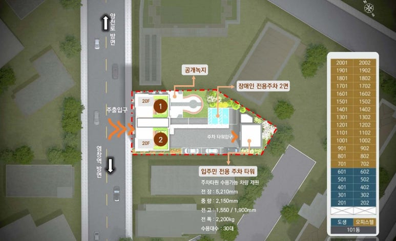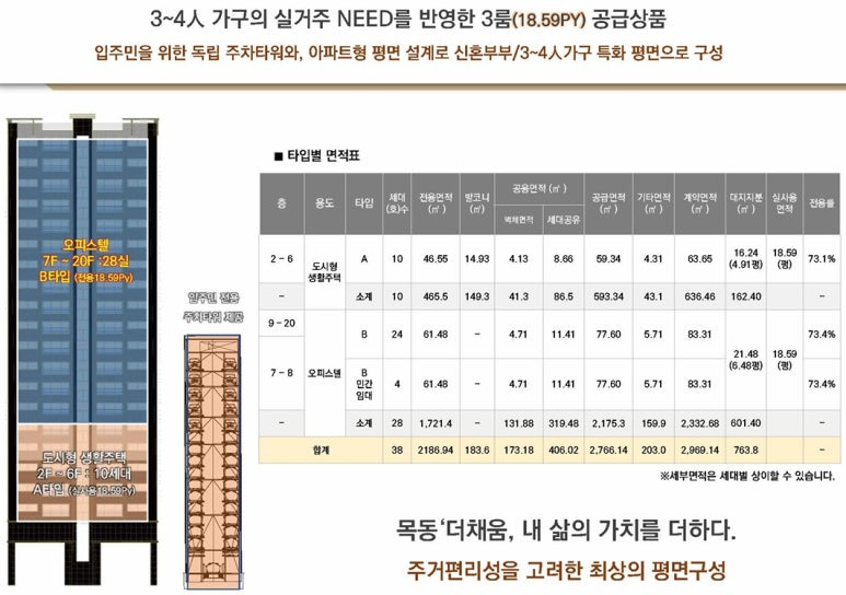 주거동 (총38세대) / 주차타워동 (주차30대) 등 총 2개동으로 구성된 3룸 1거실의 주거형 상품