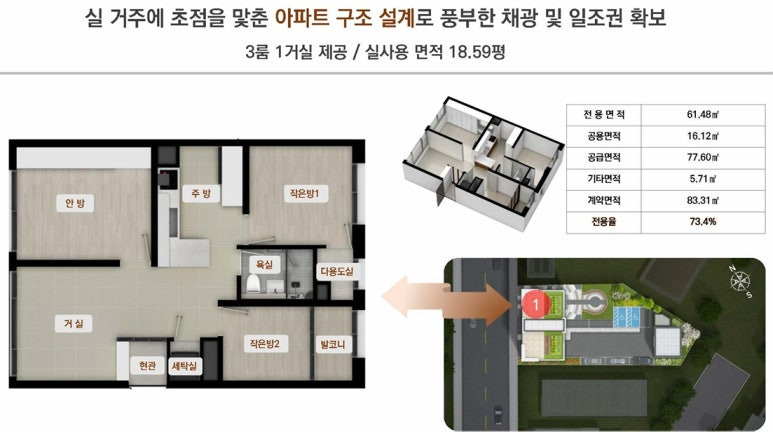 ▶ 3~4인 가구의 실거주 NEED를 반영한 3룸 (18.59PY)공급 상품 입주민을 위한 독립주차타워와, 아파트형 평면 설계로 신혼부부 /3~4인 가구 특화평면