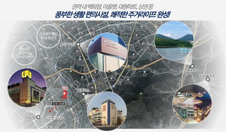 ▶ 롯데백화점, 홈플러스, 이마트 등 대형 마트 생활인프라 이용이 양호 하며, 백운호수 등 녹색 자연환경 라이프