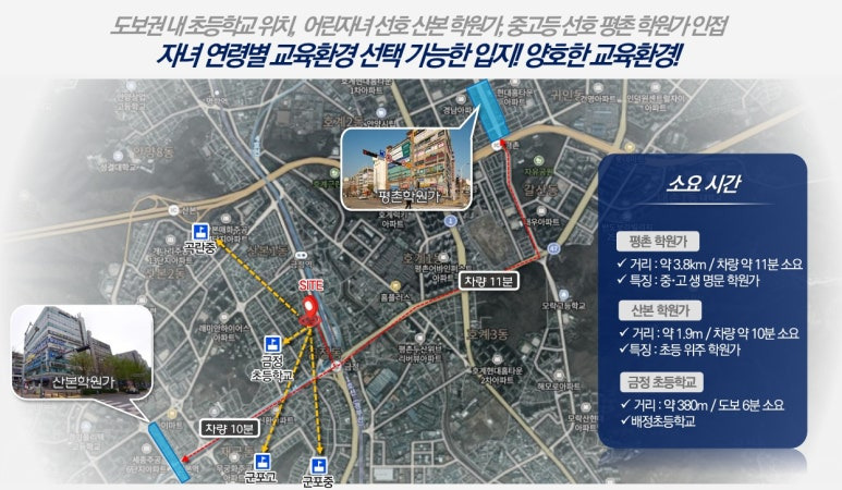 ▶ 사업지 인근 금정초 약 380m 도보 6분거리에 위치하여 안심 통학권, 또한 배정초, 중.고교 등 위치, 평촌 학원가, 산본 학원가 등이 형성 대어 교육 인프라 이용이 수월