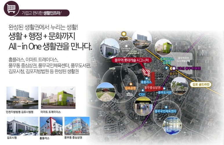 ▶ 사업지 인근 홈플러스, 이마트 트레이더스, 풍무 중심상권, cgv 등 원스톱으로 누리는 탁월한 생활 인프라 매우 우수한 입지