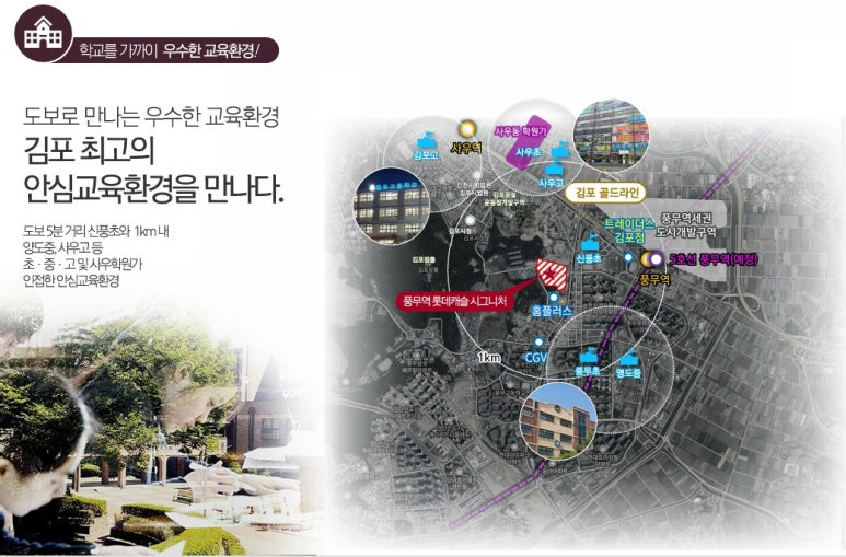 ▶ 사업지 인근 약300m 신풍초 인접하여 안심 안전한 도보 통학이 가능한 교육환경 입지, 양도중 1km 이내 위치 또한 인근 사교육시설 사우동, 풍무동 학원가 위치하여 도보 이용 가능한 입지