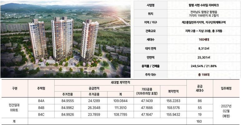 ▶ 전라남도 함평군 함평읍 기각리 198번지 외 일원 / 지하2층 ~ 지상20층(최고층) 총3개동 / 공동주택(아파트) 총160세대, 복리부대시설, 근린생활시설 등 공급예정