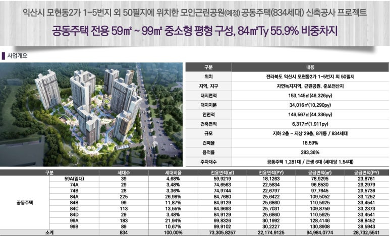 ▶ 전라북도 익산시 모현동2가 1-5번지 외 일원 / 지하2층 ~ 지상29층(최고층) 총8개동 / 공동주택(아파트) 총834세대, 복리부대시설, 근린생활시설 등 공급예정