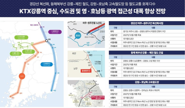 ▶ 사업지는 강릉ic 차량기준 약 8분 소요, 동해고속도로 및 영동고속도로 진입 용이, 서울및 인근 강원 지역 접급성 우수. ktx강릉역 차량기준 약10분, 서울 접근성 우수한 입지, 동해북부선 경강선, 강원, 호남 철도 등 철도개발 계획다수로 향후 접근성 더욱 개선 전망, 단지 북동측 신규도로 개설 예정으로 인근단지와 분리되는 교통망 확보