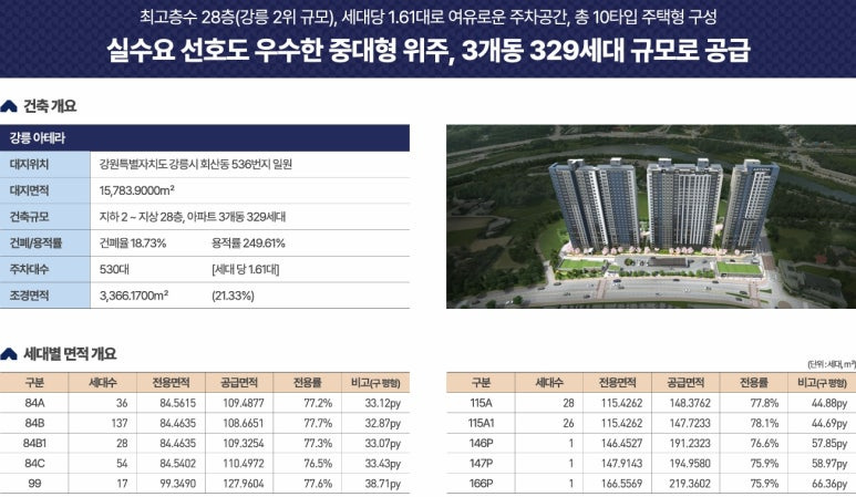 ▶ 강원특별자치도 강릉시 회산동 536번지 외 일원 / 지하2층 ~ 지상29층(최고층) 총3개동 / 공동주택(아파트) 총329세대, 복리부대시설, 근린새활시설 등 공급예정
