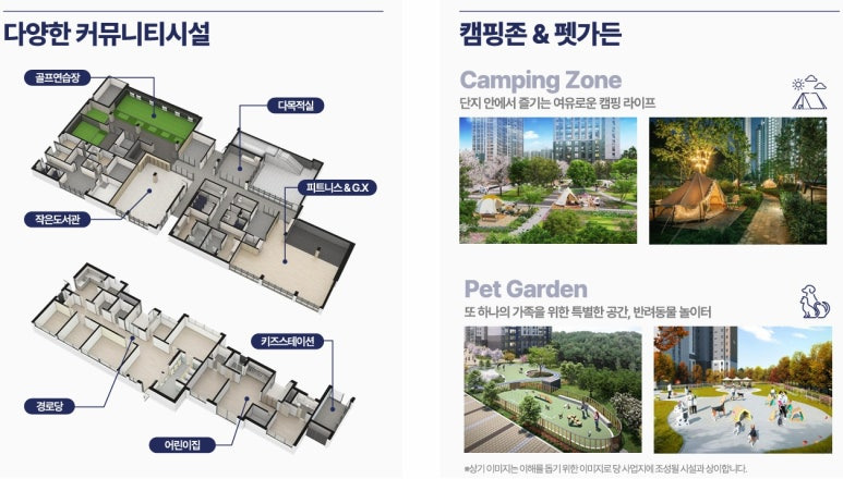 ▶ 단지 북측 소나무숲 및 남대천 소재로 우수한 자연환경 보유 단지 외부의 자연 환경과 내부 글램핑장, 펫라운지 등 특화시설의 조화로 특별하고 여유로운 생활, 아파트 및 단독주택 밀집지역으로 쾌적한 정주여건
