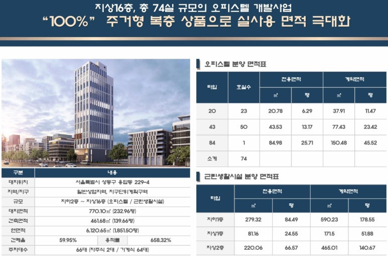 ▶ 서울특별시 성동구 용답동 229-4 외 일원 / 지하2층 ~ 지상16층 총1개동 / 주거용 오피스텔 총74실, 복리부대시설, 근린생활시설 등 공급