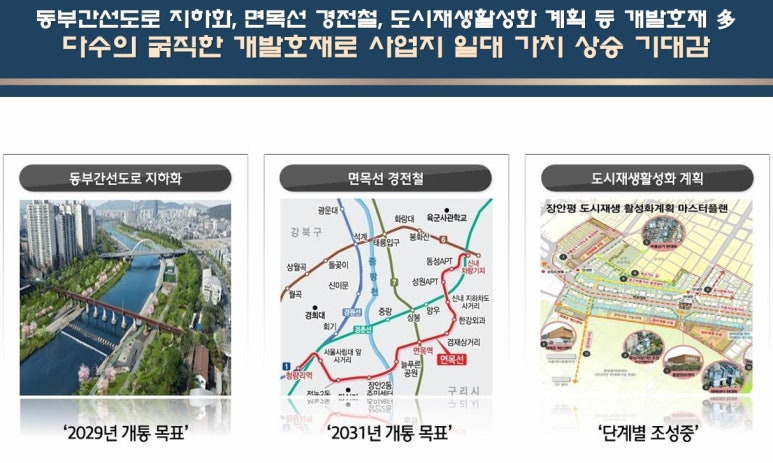▶ 당 사업지는 지하철 5호선 장한평역 도보 2분거리의 초역세권입지, 동부간선도로 지하화(예정), 경전철 면목선(개통예정)으로 대중교통 망을 통한 수도권 내 이동이 편리한 입지, 동부간선도로 이용 시 강변북로 및 내부순환로 진.출입이 편리