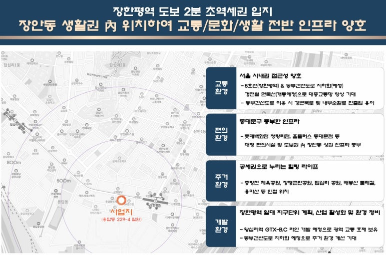 ▶ 사업지는 동대문구 풍부한 인프라, 롯데백화점 청량리점, 홈플러스 동대문점 등 대형 편의시설이 도보권 내 위치 또한 장안동 상업지역 인접 풍부한 인프라 입지