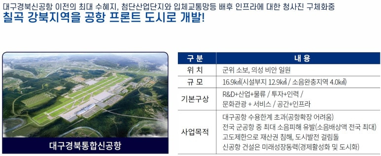 ▶ 당 사업지는 대구경북신공항 이전의 최대 수혜지, 첨단산업단지와 입체교통망등 배후 인프라에 대한 청사진 구체화로 칠곡 강북지역을 공항 프론츠 도시로 개발 예정