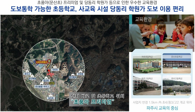 ▶ 사업지 바로 앞 문산초, 문산동중,파주고 등 도보로 누리는 교육환경, 당동리 학원가 1km 내 위치, 도서관 약 700m 도보이용 가능한 문산 중심 교육환경 양호