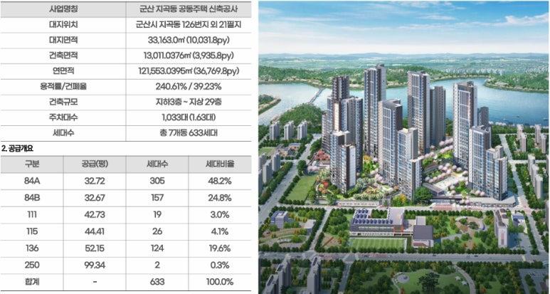 ▶ 군산시 지곡동 126번지 외 일원 / 지하3층 ~ 지상29층(최고층) 총7개동 / 공동주택(아파트) 총633세대, 복리부대시설, 근린생활시설 등 공급예정