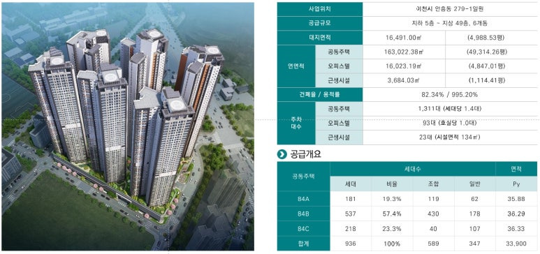▶ 당 사업지는 경기도 이천시 안흥동 279-1번지 일원으로 지하5층 ~ 지상49층(최고층), 6개동 84타입 총 936세대 및 상업시설로 공급 예정