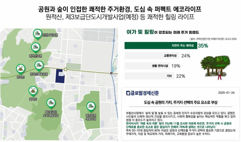 ▶ 사업지 내 어린이공원, 인근 원적산, 장수산, 원적산 공원, 제3보급단 부지 공원 녹지 계획으로 쾌적한 힐링 라이프 입지