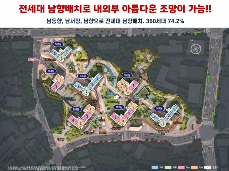 배치, 전세대 선호도 높은 남서향, 남동향 호실을 중심 배치하여 쾌적한 주거 환경 영위