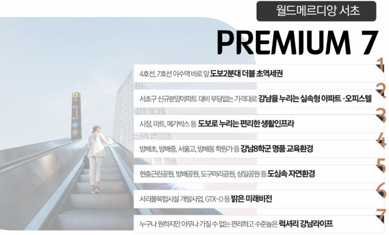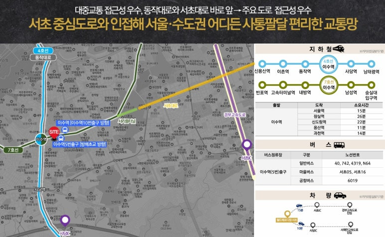 ▶ 당 사업지는 이수역(4호선, 7호선) 바로앞 도보2분거리 더블 초역세권 입지로 대중교통을 통한 서울 시.내외 이동이 편리, 또한 단지 바로앞 버스정류장 대중교통 우수, 서초대로, 동작대로, 서로ic(경부고속도로) 인접으로 진입이 편리하여 주변 광역도시로 이동이 편리