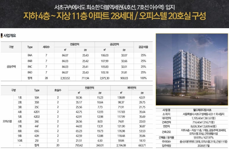 ▶ 서울특별시 서초구 방배동422-1 외 일원 / 지하4층 ~ 지상11층 총1개동 / 공동주택(아파트) 28세대, 주거용 오피스텔 20세대, 근린생활시설, 복리부대시설 등 공급예정